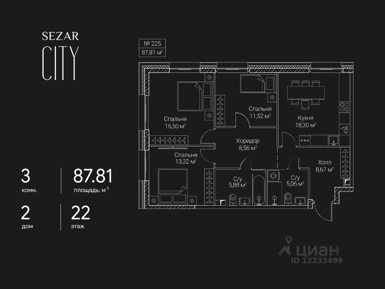 Продается 3-комнатная квартира в ЖК SEZAR CITY на 22 этаже. Общая площадь квартиры составляет 87,81 кв.м. Квартира без отделки. Срок сдачи - 2027 год.