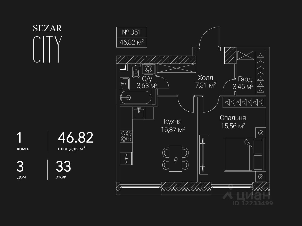 Продается 1-комнатная квартира в ЖК SEZAR CITY на 33 этаже. Общая площадь квартиры составляет 46,82 кв.м. Квартира без отделки. Срок сдачи - 2027 год.