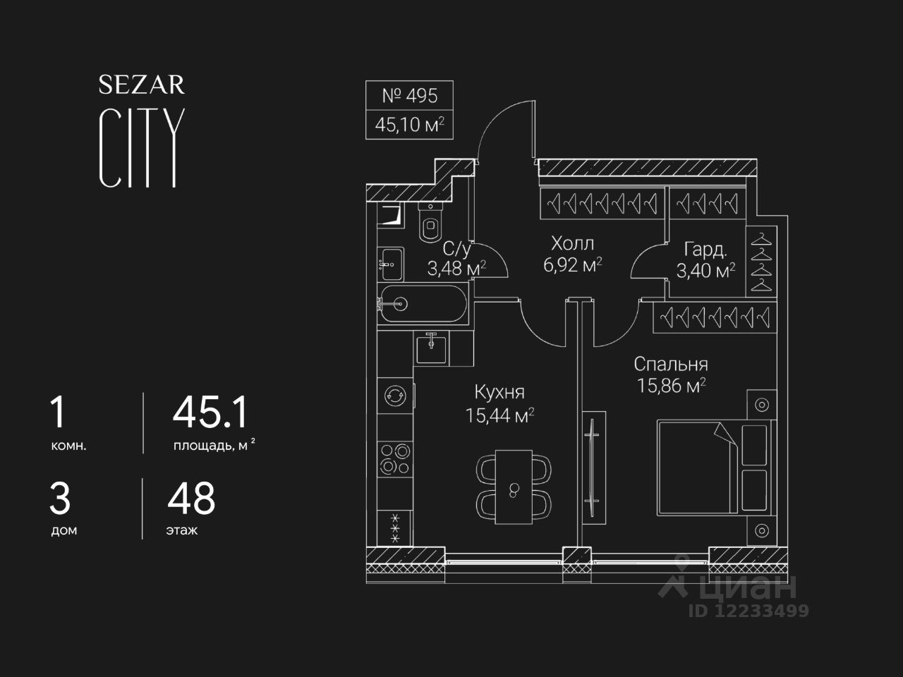 Продается 1-комнатная квартира в ЖК SEZAR CITY на 48 этаже. Общая площадь квартиры составляет 45,1 кв.м. Квартира без отделки. Срок сдачи - 2027 год.
