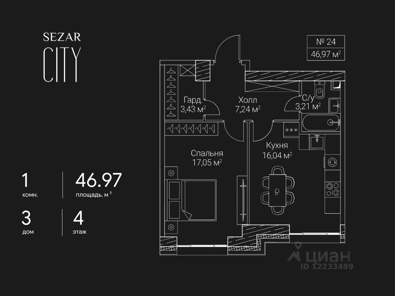 Продается 1-комнатная квартира в ЖК SEZAR CITY на 4 этаже. Общая площадь квартиры составляет 46,97 кв.м. Квартира без отделки. Срок сдачи - 2027 год.