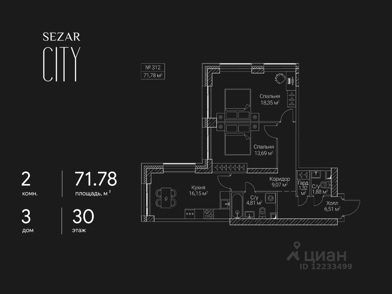 Продается 2-комнатная квартира в ЖК SEZAR CITY на 30 этаже. Общая площадь квартиры составляет 71,78 кв.м. Квартира без отделки. Срок сдачи - 2027 год.