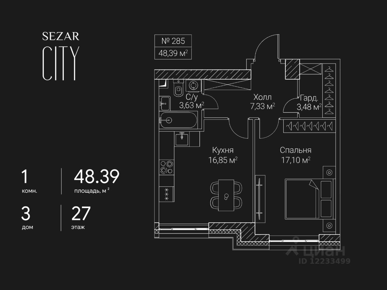 Продается 1-комнатная квартира в ЖК SEZAR CITY на 27 этаже. Общая площадь квартиры составляет 48,39 кв.м. Квартира без отделки. Срок сдачи - 2027 год.