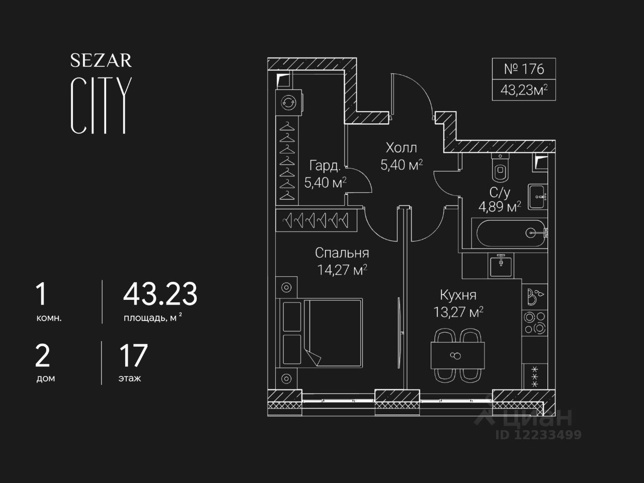 Продается 1-комнатная квартира в ЖК СЕЗАР СИТИ на 17 этаже. Общая площадь квартиры составляет 43,23 кв.м. Квартира без отделки. Срок сдачи - 2027 год.