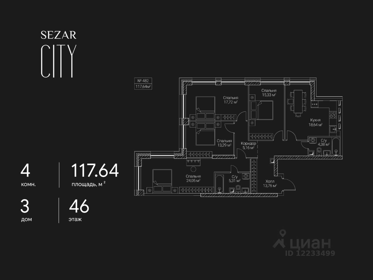 Продается 4-комнатная квартира в ЖК SEZAR CITY на 46 этаже. Общая площадь квартиры составляет 117,64 кв.м. Квартира без отделки. Срок сдачи - 2027 год.