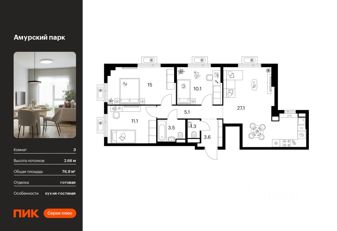 продам 3-к, Амурский парк ЖК, 4.325 229 107 ₽