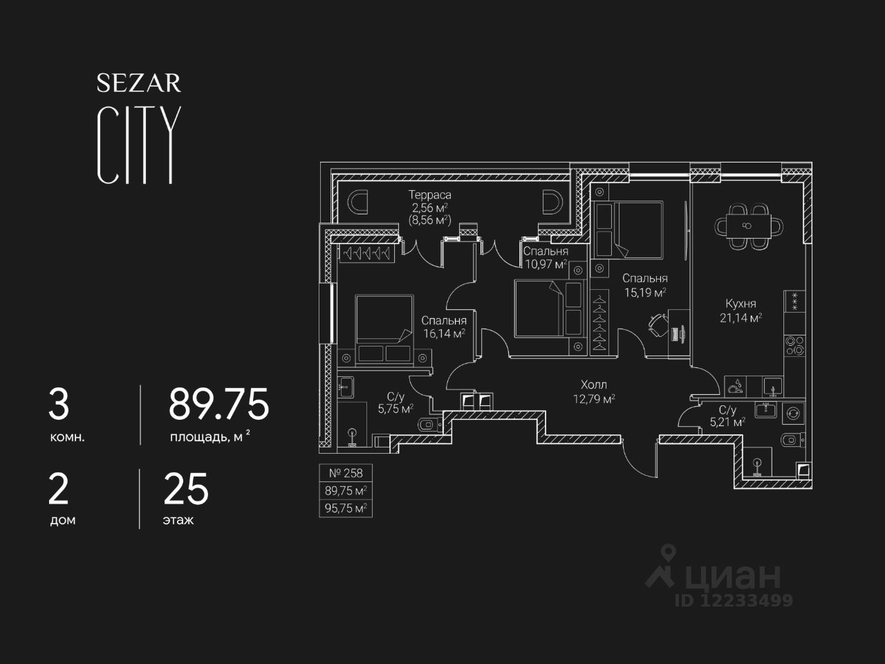 Продается 3-комнатная квартира в ЖК SEZAR CITY на 25 этаже. Общая площадь квартиры составляет 89,75 кв.м. Квартира без отделки. Срок сдачи - 2027 год.