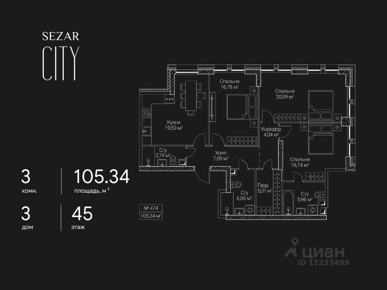 Продается 3-комнатная квартира в ЖК SEZAR CITY на 45 этаже. Общая площадь квартиры составляет 105,34 кв.м. Квартира без отделки. Срок сдачи - 2027 год.