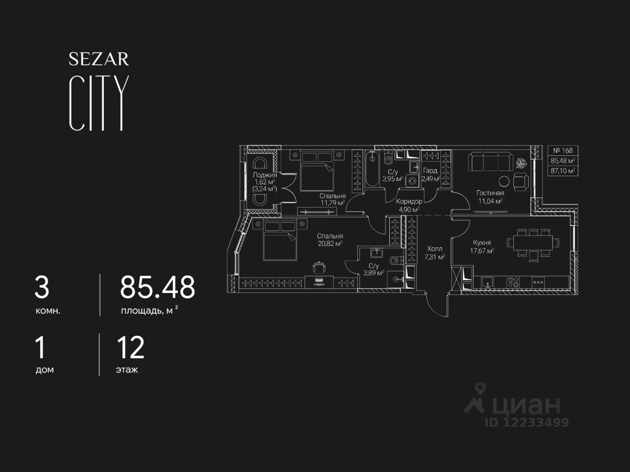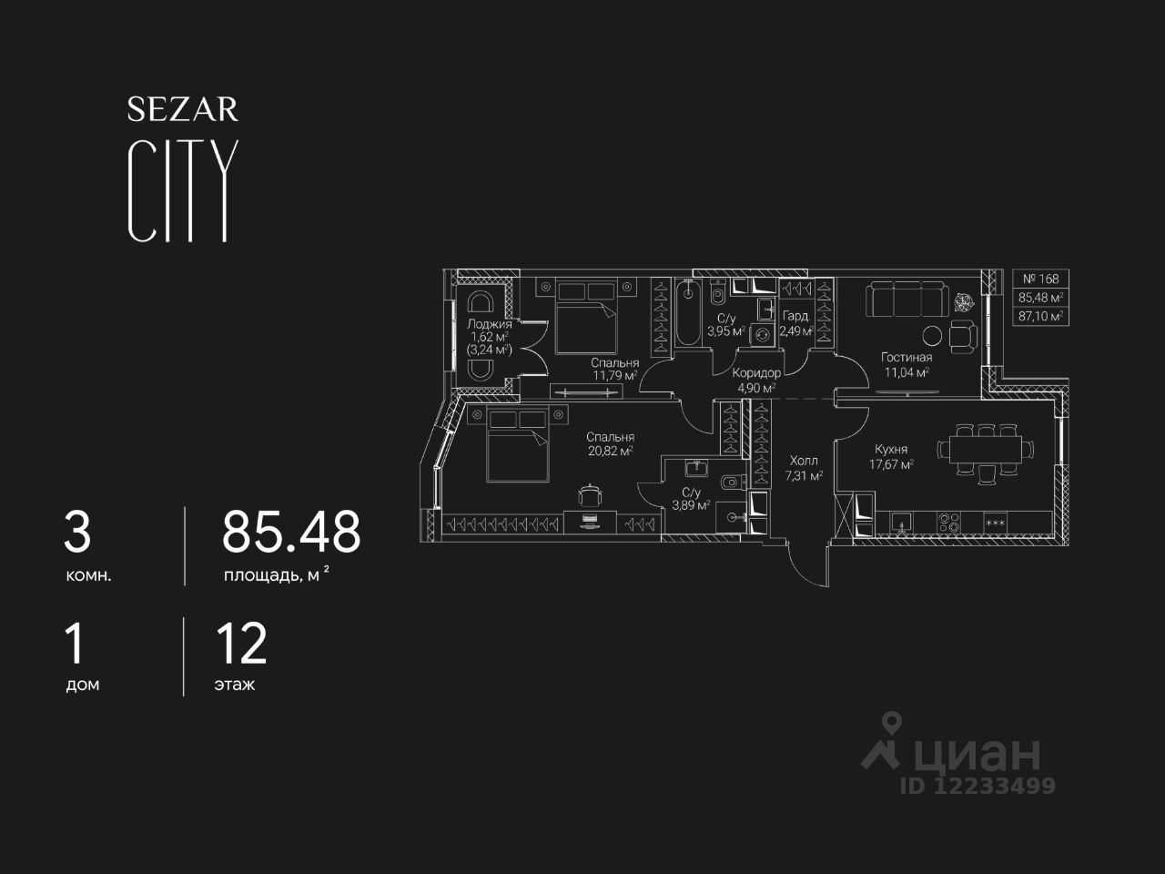 Продается 3-комнатная квартира в ЖК SEZAR CITY на 12 этаже. Общая площадь квартиры составляет 85,48 кв.м. Квартира без отделки. Срок сдачи - 2027 год.