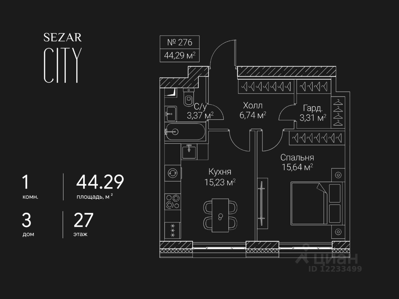 Продается 1-комнатная квартира в ЖК SEZAR CITY на 27 этаже. Общая площадь квартиры составляет 44,29 кв.м. Квартира без отделки. Срок сдачи - 2027 год.