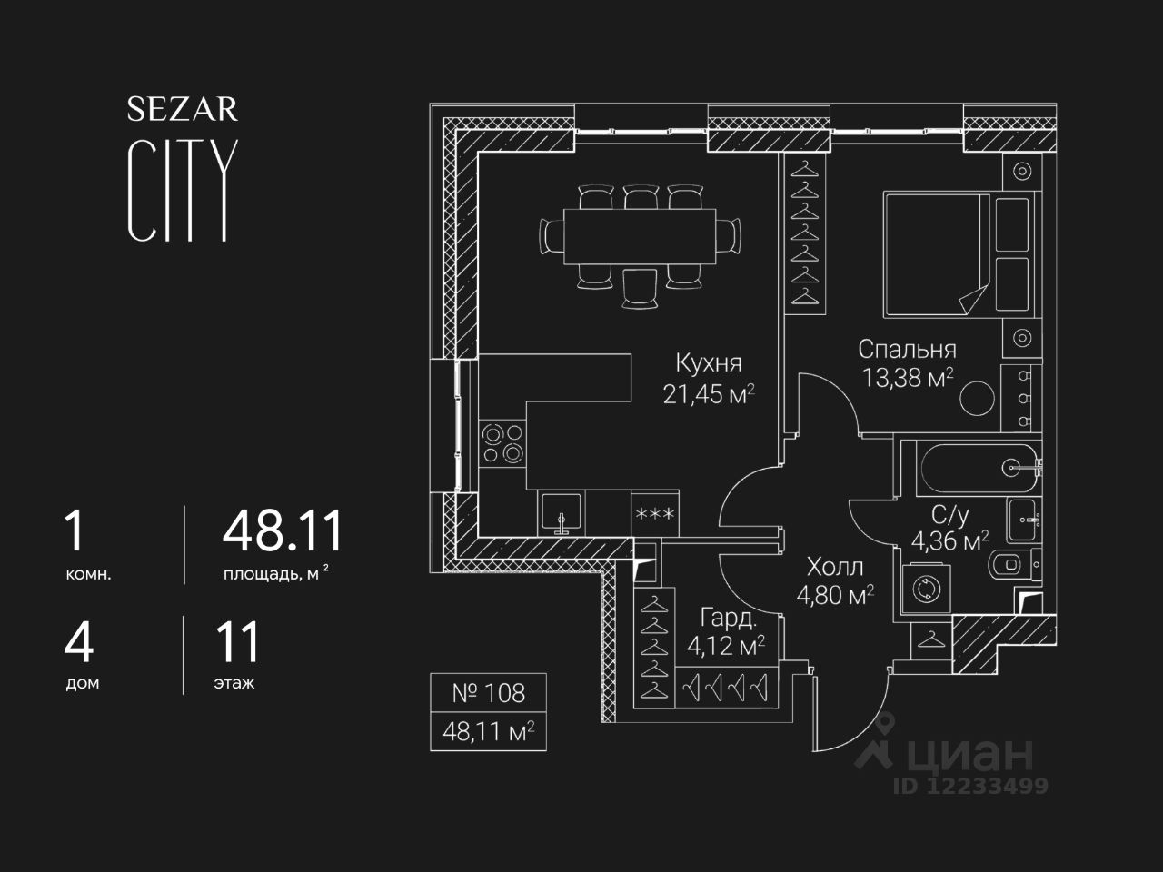 Продается 1-комнатная квартира в ЖК SEZAR CITY на 11 этаже. Общая площадь квартиры составляет 48,11 кв.м. Квартира без отделки. Срок сдачи - 2027 год.
