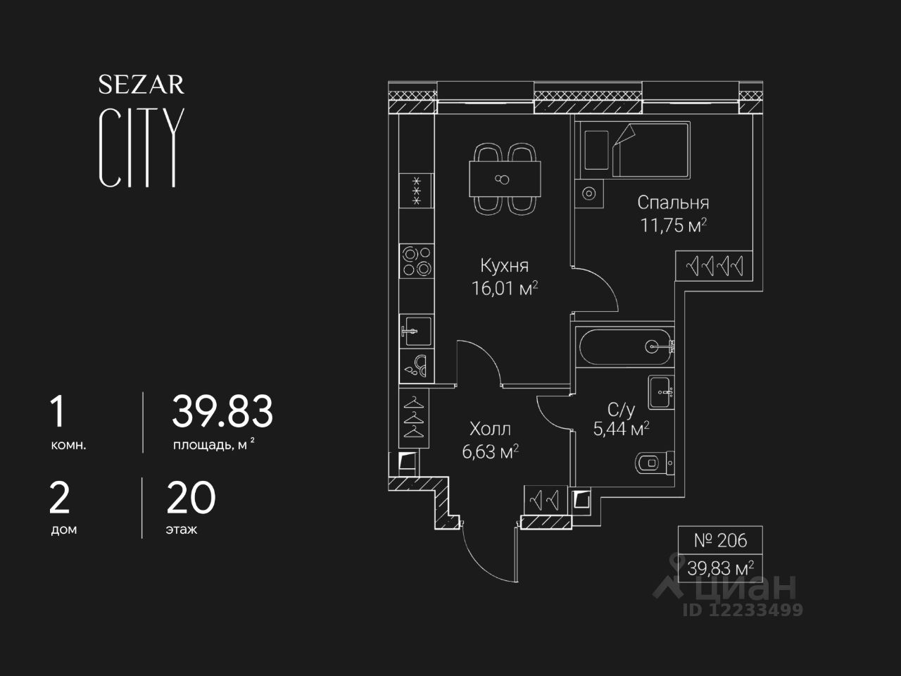 Продается 1-комнатная квартира в ЖК SEZAR CITY на 20 этаже. Общая площадь квартиры составляет 39,83 кв.м. Квартира без отделки. Срок сдачи - 2027 год.