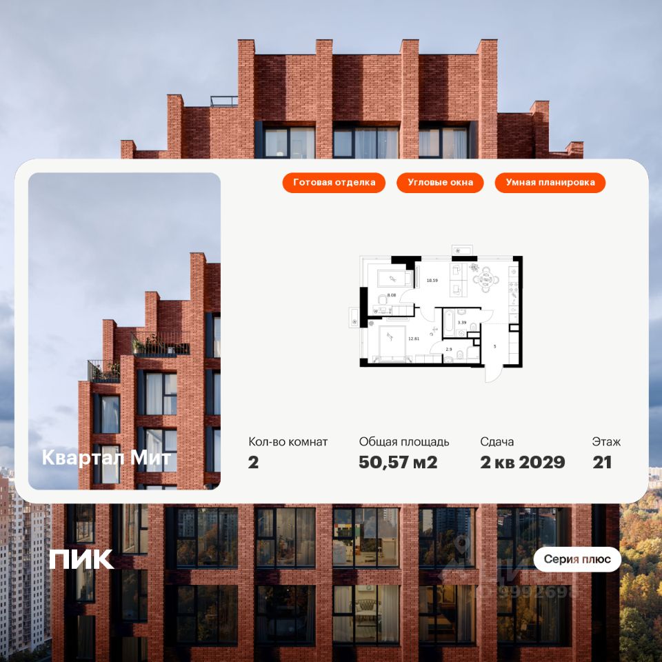 Новостройка! Продается 2-комн. кв-ра площадью 50,57 кв.м, (Корпус 3.4, Секция 4) 20 этаж 32-этажного дома в Квартал Мит от ПИК. ''Квартал Мит'' строится в экологически чистом районе Митино, где по соседству расположен большой лесопарк, а с двух сторон протекают реки Сходня и Журавка. Для семей с детьми здесь появится школа и два детских сада. В 20 минутах пешком находится станция метро ''Пятницкое шоссе'', а за 10 минут на автомобиле можно доехать до МКАД.