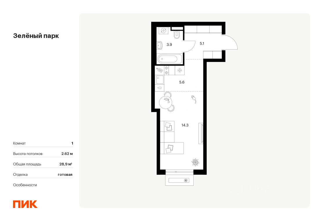 Продаётся квартира-студия площадью 28,9 кв.м на 4 этаже 13 этажного дома (Корпус 5.3, Секция 3) проекта ПИК Зелёный парк. Светлый просторный подъезд на уровне земли, функциональная планировка, большие окна, c отделкой.