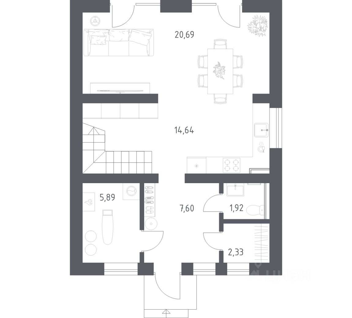 В базовую комплектацию включена металлическая входная дверь, двухкамерные стеклопакеты. Отсутствие межкомнатных перегородок позволит вам адаптировать пространство под себя.