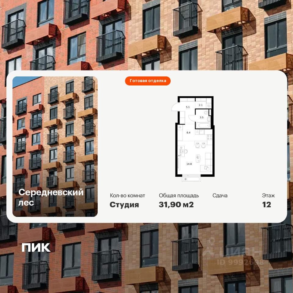 Продаётся квартира-студия площадью 31,9 кв.м на 13 этаже 16 этажного дома (Корпус 2.1.1, Секция 1) проекта ПИК Середневский лес. Светлый просторный подъезд на уровне земли, функциональная планировка, большие окна, c отделкой.