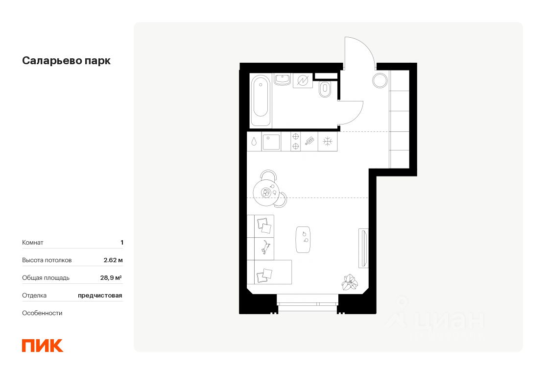 Продаётся квартира-студия площадью 28,9 кв.м на 14 этаже 23 этажного дома (Корпус 69.1, Секция 1) проекта ПИК Саларьево парк. Светлый просторный подъезд на уровне земли, функциональная планировка, большие окна, предчистовая отделка.