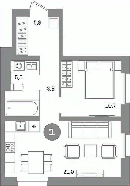 По квартире: -Общая площадь 46,8 кв.м -спальня 10,5 кв.м -Просторная кухня-гостиная, площадью 21 кв.м с 2-мя окнами -Совмещенный просторный сан узел 5,5 м2 -Без обременений! Код пользователя: 105827