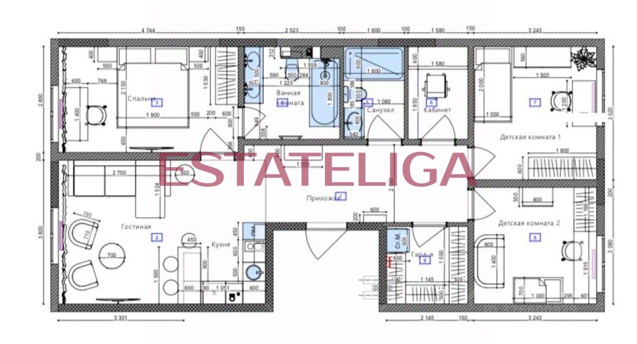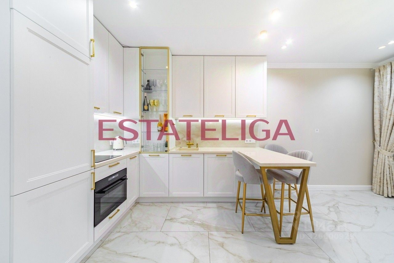 КВАРТИРА: В отделке были использованы только качественные и дорогостоящие материалы от ведущих брендов. Просторная кухня-гостиная с встроенным кухонным гарнитуром со всей необходимой техникой Kuppersberg (варочная панель, вытяжка, духовой шкаф, холодильник, посудомоечная машина), установлен измельчитель столешница из натурального камня, вместительный диван. Мастер-спальня включает в себя двуспальную кровать, ниши для хранения вещей, а также свой санузел с ванной. Две изолированные детские комнаты со всей необходимой комплектующей для комфортного проживания Вашего ребенка. Вместительная гардеробная (включают в себя в том числе стиральную и сушильную технику Miele). Кабинет. Гостевой санузел с душевой.