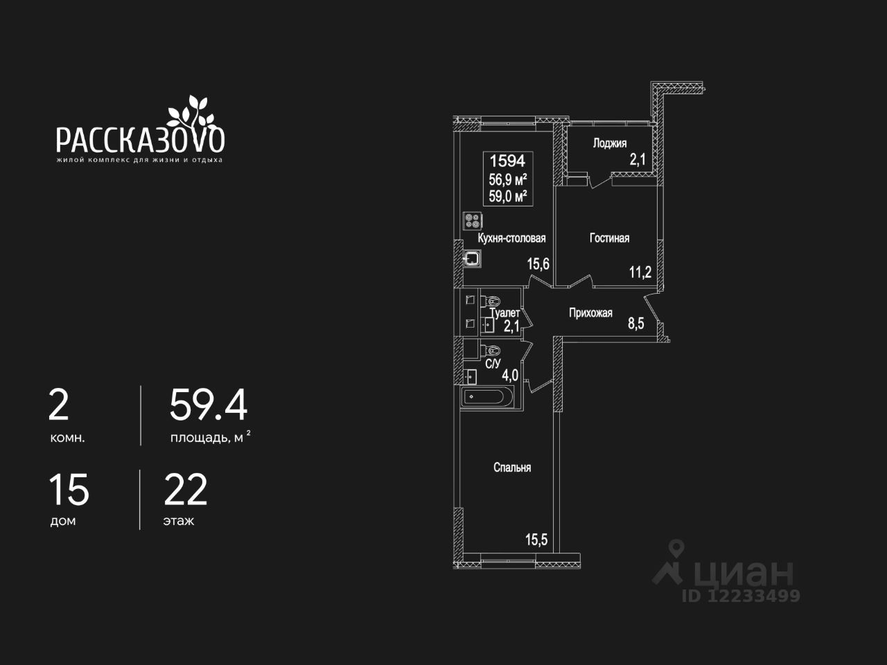 Продается 2-комнатная квартира в ЖК Рассказово на 22 этаже. Общая площадь квартиры составляет 59,4 кв.м. Квартира без отделки.