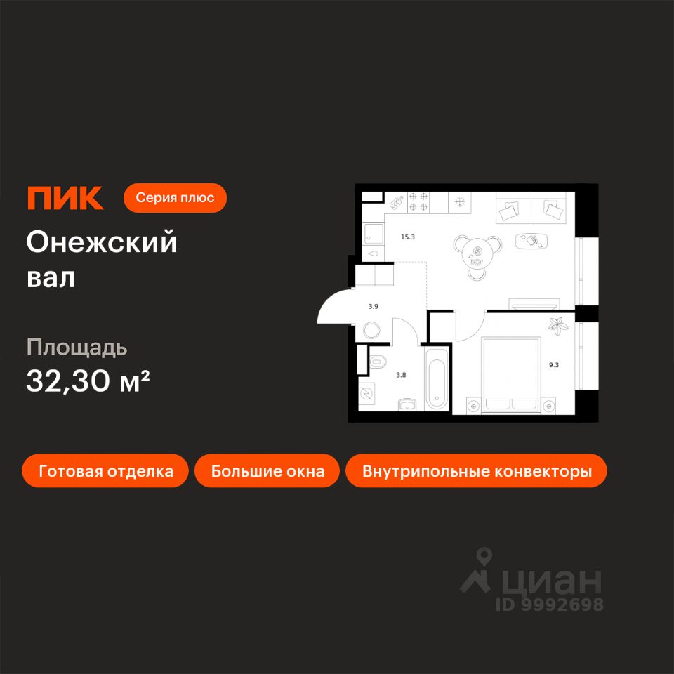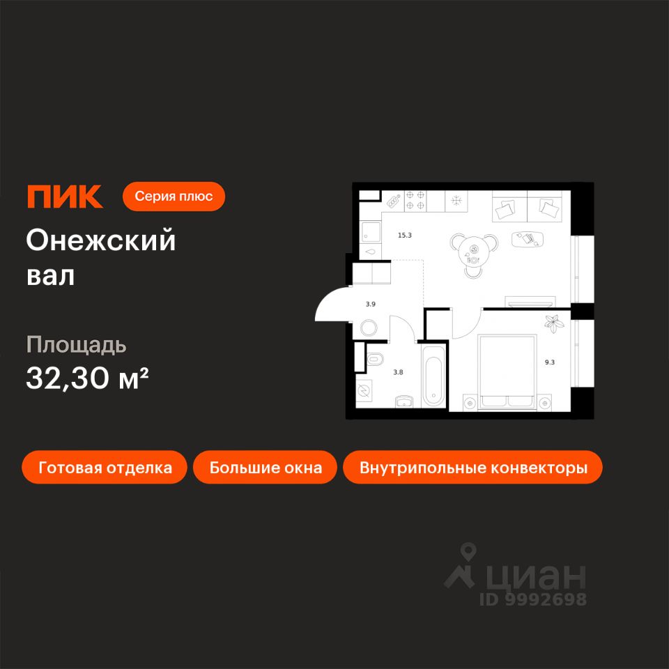 Новостройка! Продается 1-комн. кв-ра площадью 32,3 кв.м, (Корпус 1.1.1, Секция 1) 4 этаж 23-этажного дома в Онежский вал от ПИК. Квартал ''Серии плюс'' строится на севере Москвы, в 10 минутах пешком от станции метро ''Селигерская'' и МЦД ''Моссельмаш''. Проект понравится всем, кто привык к комфортной жизни и ценит возможность оставаться в ритме большого города и быстро добираться до центра столицы. Концепция проекта связывает квартал с природой Русского Севера. В проекте три акцентные башни с террасами и контрастными фасадами из матовой плитки и металла. Корпуса разной этажности повторяют силуэты хвойных деревьев, а архитектурные элементы на фасадах — напоминают природные рисунки скал. Блестящие алюминиевые панели в тон матовой плитке создают игру текстур на верхушках корпусов.