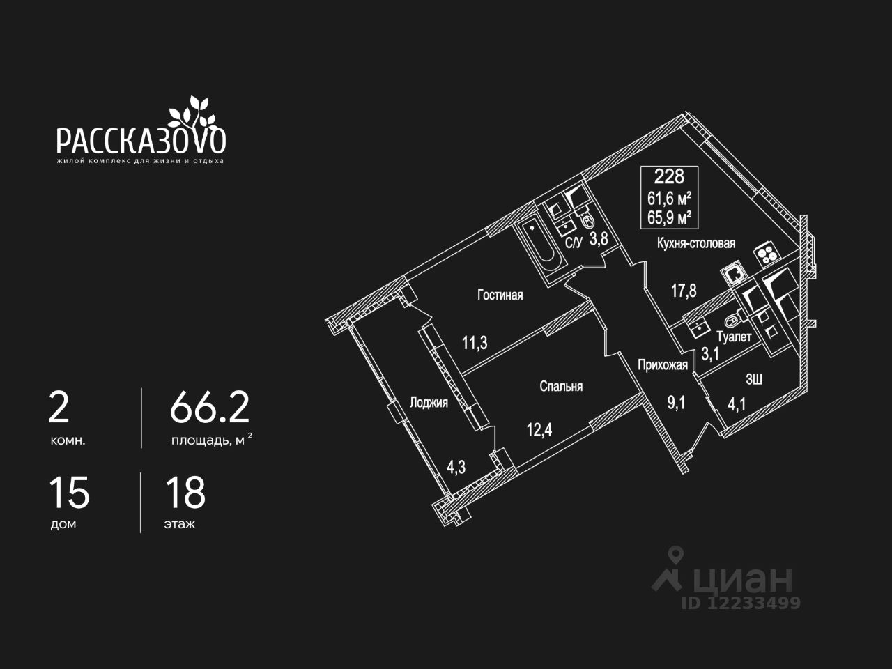 Продается 2-комнатная квартира в ЖК Рассказово на 18 этаже. Общая площадь квартиры составляет 66,2 кв.м. Квартира без отделки.