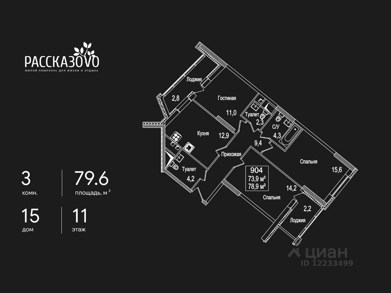 Продается 3-комнатная квартира в ЖК Рассказово на 11 этаже. Общая площадь квартиры составляет 79,6 кв.м. Квартира без отделки.