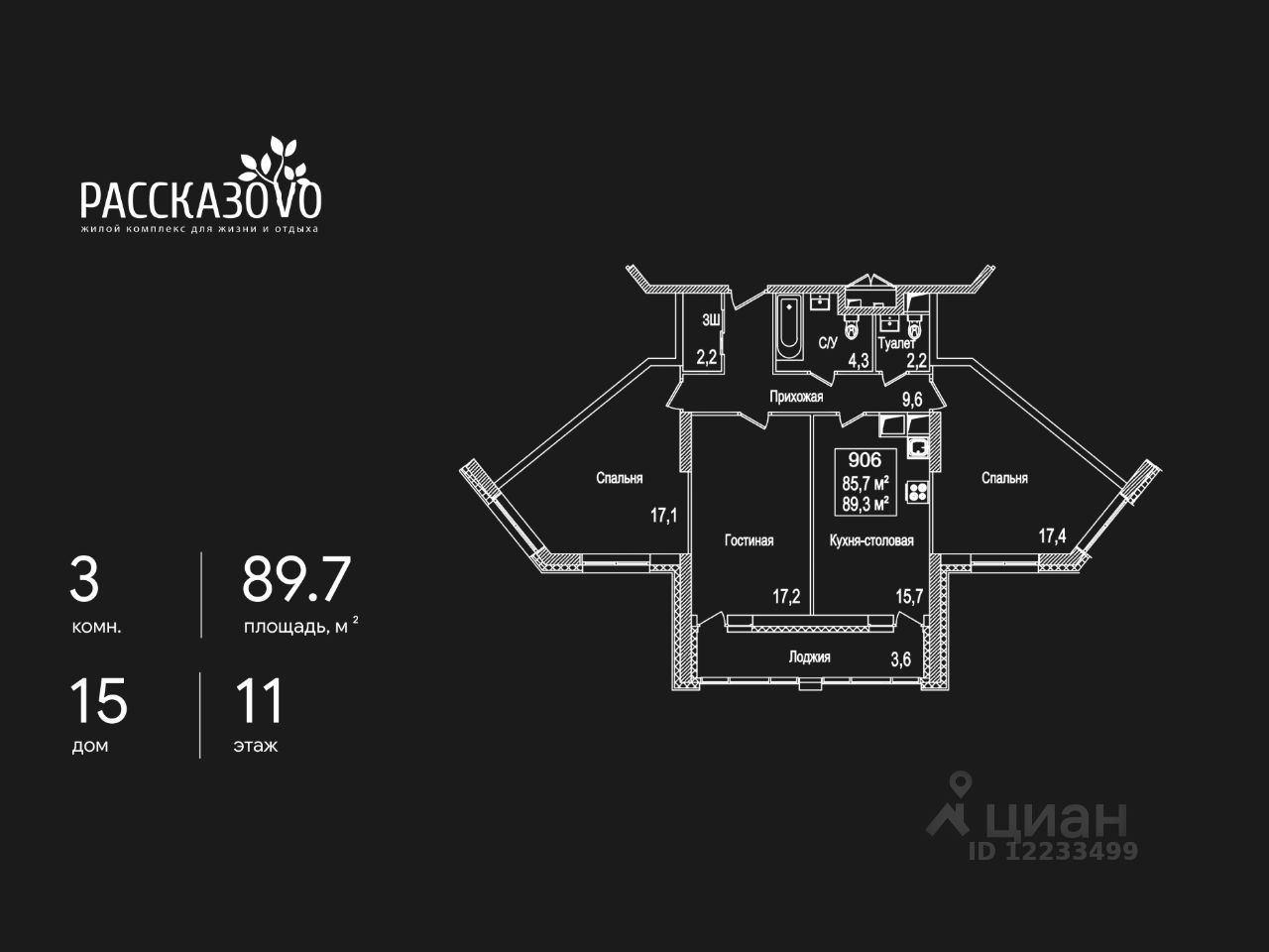 Продается 3-комнатная квартира в ЖК Рассказово на 11 этаже. Общая площадь квартиры составляет 89,7 кв.м. Квартира без отделки.