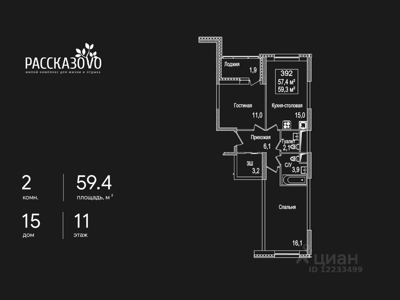 Продается 2-комнатная квартира в ЖК Рассказово на 11 этаже. Общая площадь квартиры составляет 59,4 кв.м. Квартира без отделки.