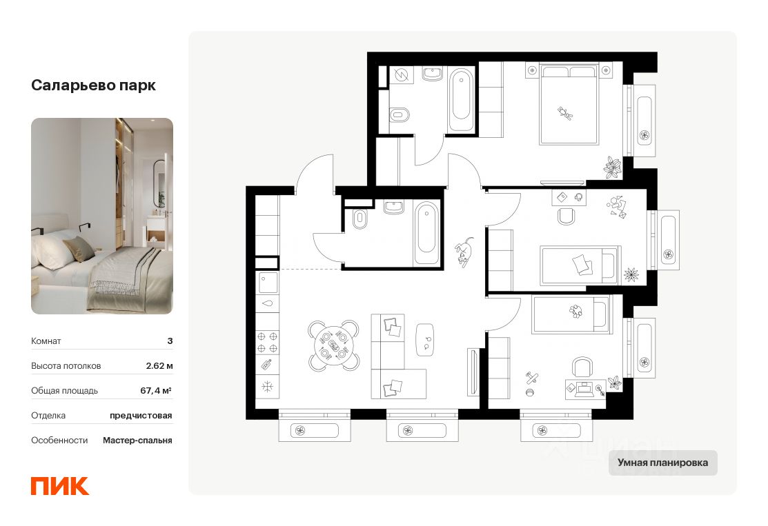 Продаётся 3-комн. квартира площадью 67,4 кв.м на 5 этаже 23 этажного дома (Корпус 69.1, Секция 1) проекта ПИК Саларьево парк. Светлый просторный подъезд на уровне земли, функциональная планировка, большие окна, предчистовая отделка.
