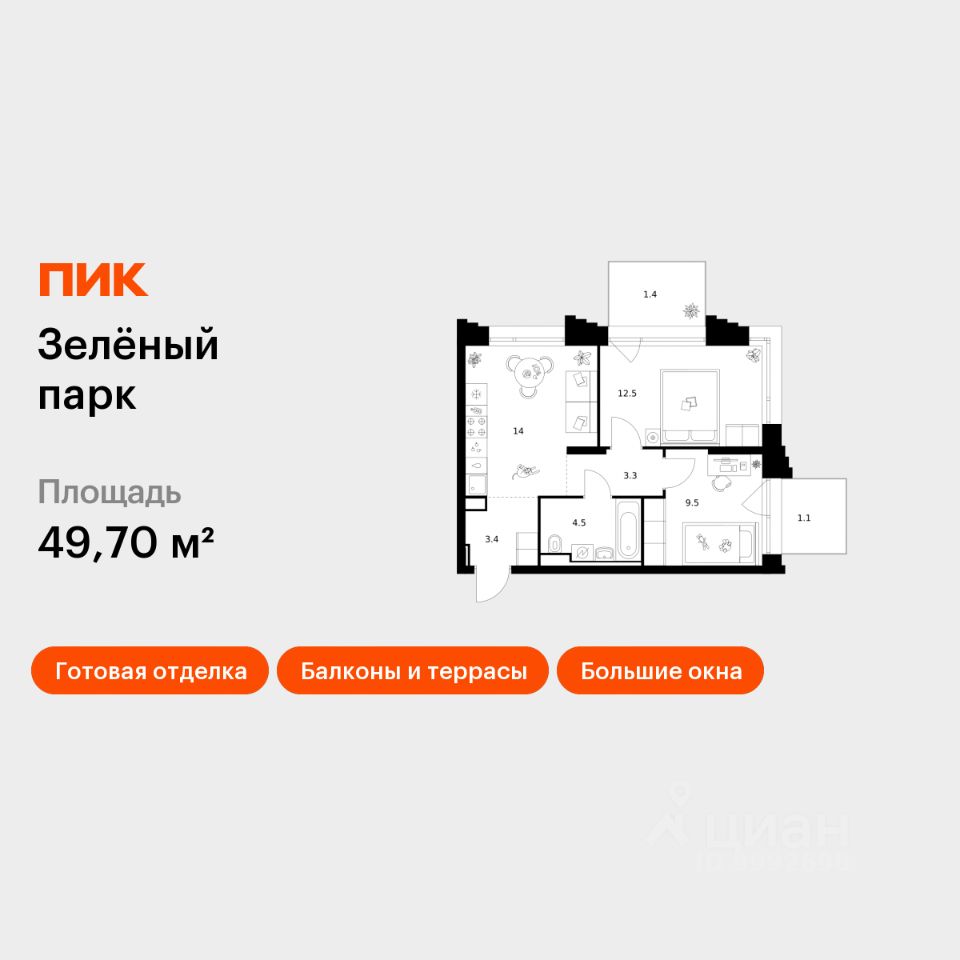 Продаётся 2-комн. квартира площадью 49,7 кв.м на 3 этаже 28 этажного дома (Корпус 5.4, Секция 5) проекта ПИК Зелёный парк. Светлый просторный подъезд на уровне земли, функциональная планировка, большие окна, c отделкой.