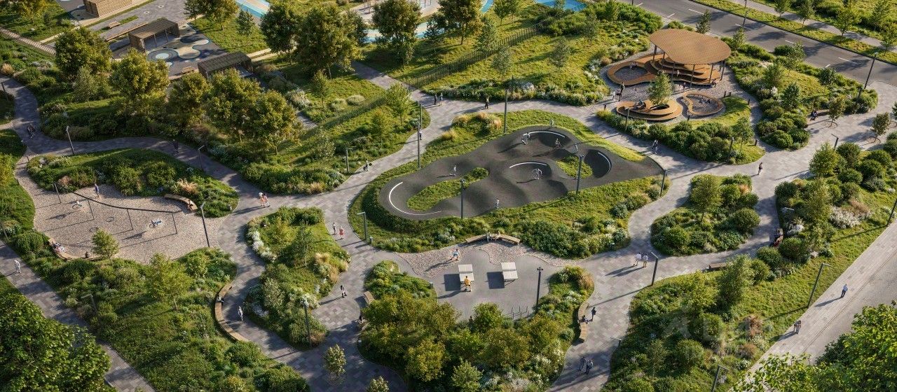 А специально для подростков мы спроектировали уникальное пространство для отдыха — памп-трек для катания, большой навес, амфитеатр и сетки для отдыха, где они смогут собираться вместе в любую погоду.