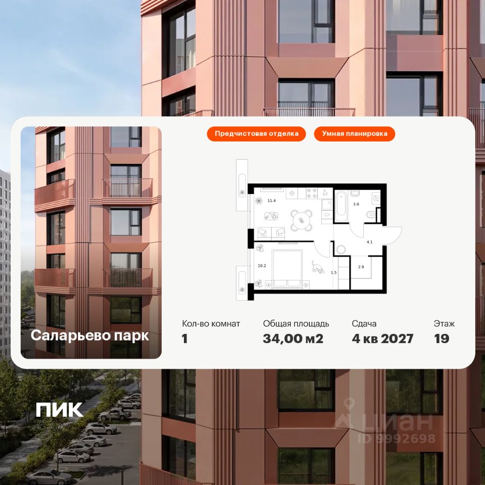 Продаётся 1-комн. квартира площадью 34 кв.м на 8 этаже 22 этажного дома (Корпус 57.3, Секция 3) проекта ПИК Саларьево парк. Светлый просторный подъезд на уровне земли, функциональная планировка, большие окна, предчистовая отделка.