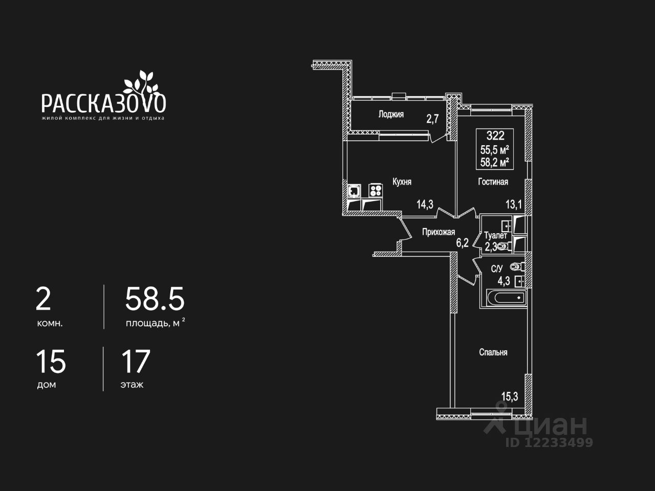 Продается 2-комнатная квартира в ЖК Рассказово на 17 этаже. Общая площадь квартиры составляет 58,5 кв.м. Квартира без отделки.