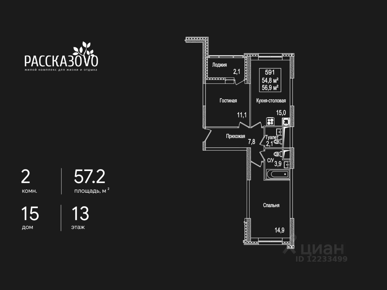 Продается 2-комнатная квартира в ЖК Рассказово на 13 этаже. Общая площадь квартиры составляет 57,2 кв.м. Квартира без отделки.