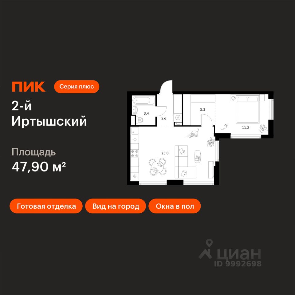 Продаётся 1-комн. квартира площадью 47,9 кв.м на 35 этаже 43 этажного дома (Корпус 1.1, Секция 1) проекта ПИК 2-й Иртышский. Светлый просторный подъезд на уровне земли, функциональная планировка, большие окна, c отделкой.
