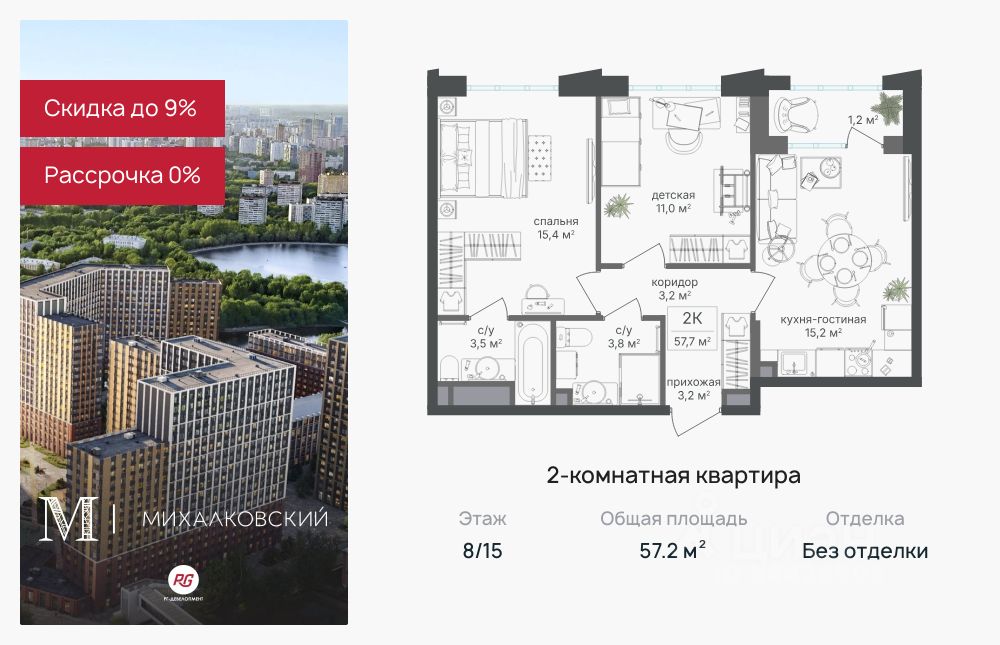 Продаётся 2-к квартира 57,2 кв.м. в ЖК ''Михалковский'' на 8-м этаже 15 этажного дома.