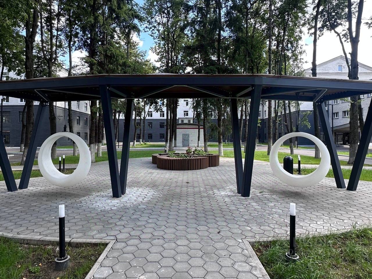Красивый двор парк с вековыми вечнозелеными деревьями создает особую загородную атмосферу старинной усадьбы. На огороженной безопасной зеленой территории расположены спортивная площадка и места отдыха, оборудован паркинг.