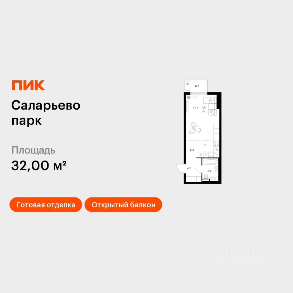 Продаётся квартира-студия площадью 32 кв.м на 5 этаже 14 этажного дома (Корпус 69.6, Секция 6) проекта ПИК Саларьево парк. Светлый просторный подъезд на уровне земли, функциональная планировка, большие окна, c отделкой.