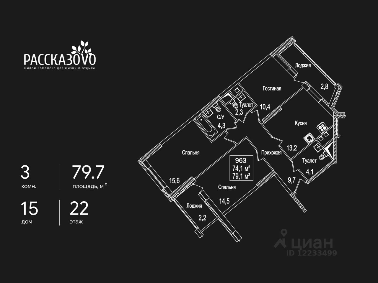 Продается 3-комнатная квартира в ЖК Рассказово на 22 этаже. Общая площадь квартиры составляет 79,7 кв.м. Квартира без отделки.