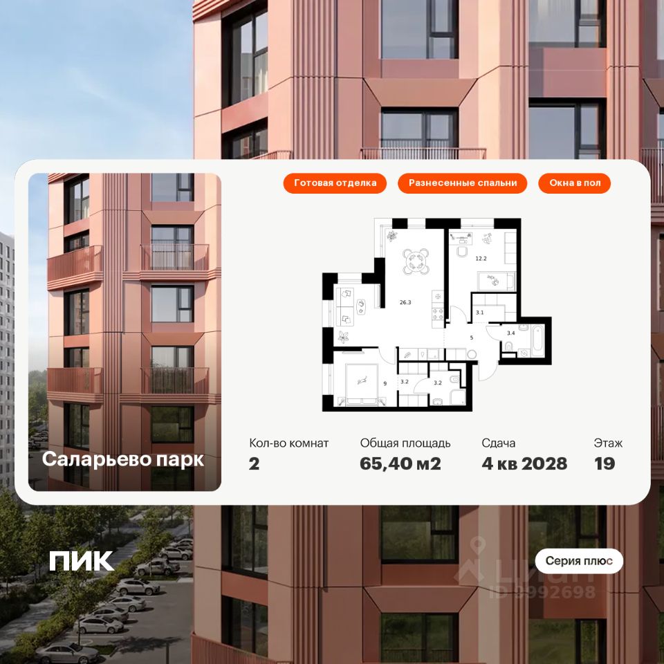 Продаётся 2-комн. квартира площадью 65,4 кв.м на 17 этаже 24 этажного дома (Корпус 82.7, Секция 7) проекта ПИК Саларьево парк. Светлый просторный подъезд на уровне земли, функциональная планировка, большие окна, c отделкой.