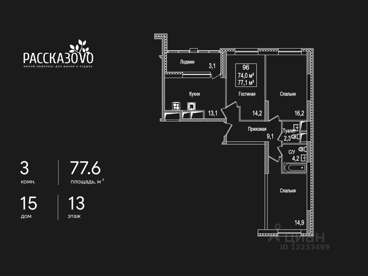 Продается 3-комнатная квартира в ЖК Рассказово на 13 этаже. Общая площадь квартиры составляет 77,6 кв.м. Квартира без отделки.