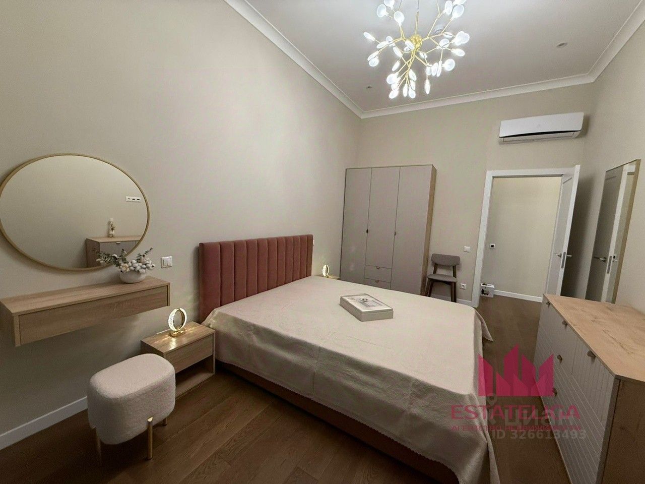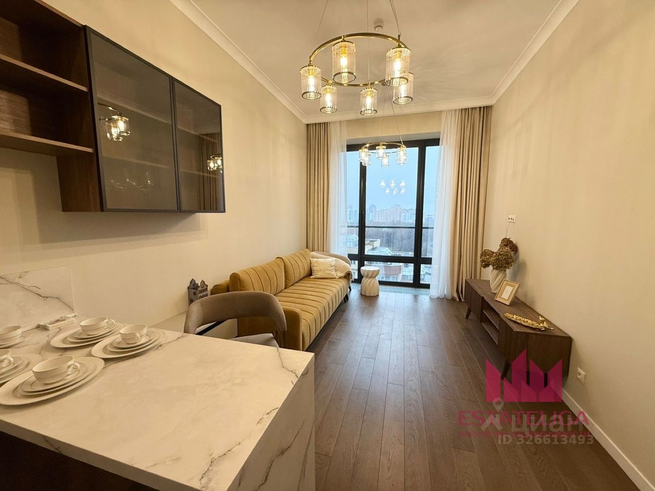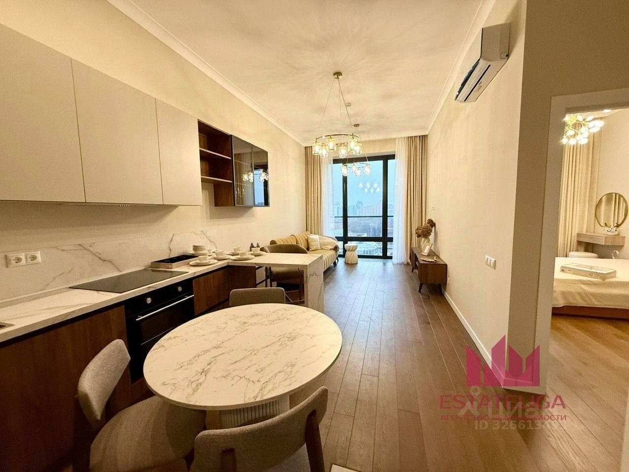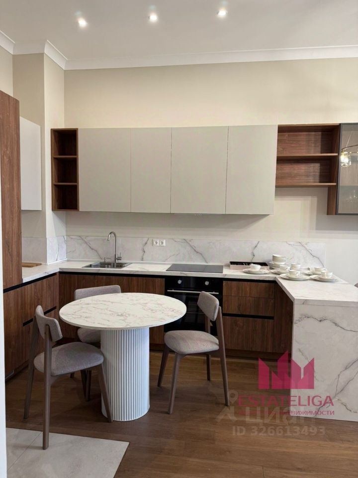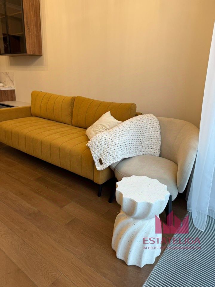 В ремонте использовались премиальные материалы, в гостиной установлен широкий кресло и уютный диван. В кухонной зоне установлен современный кухонный гарнитур со встроенной посудомоечной машиной, духовым шкафом. Ванная комната просторная, так же в ней установлена стиральная машина.