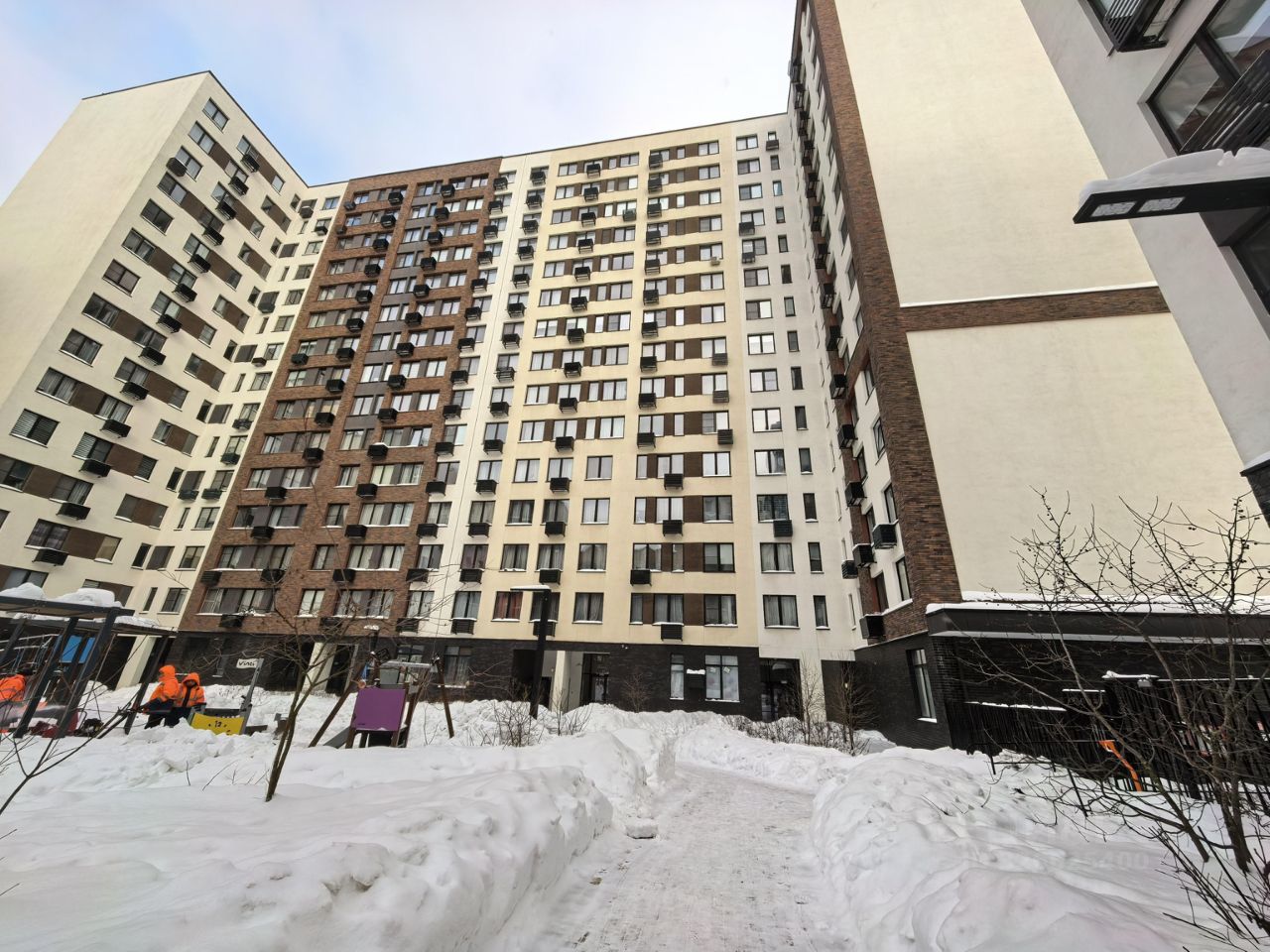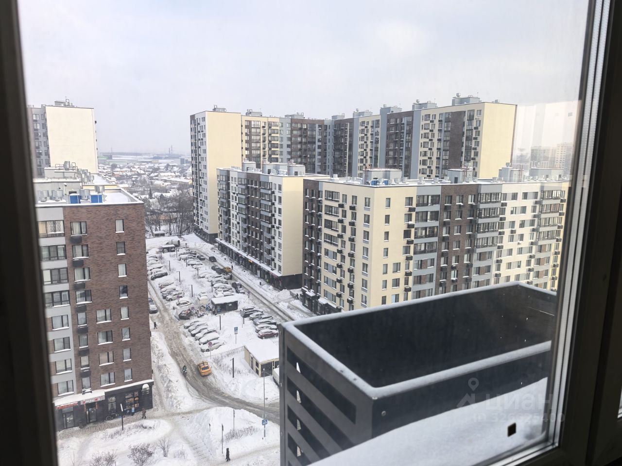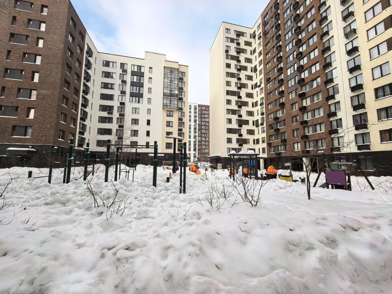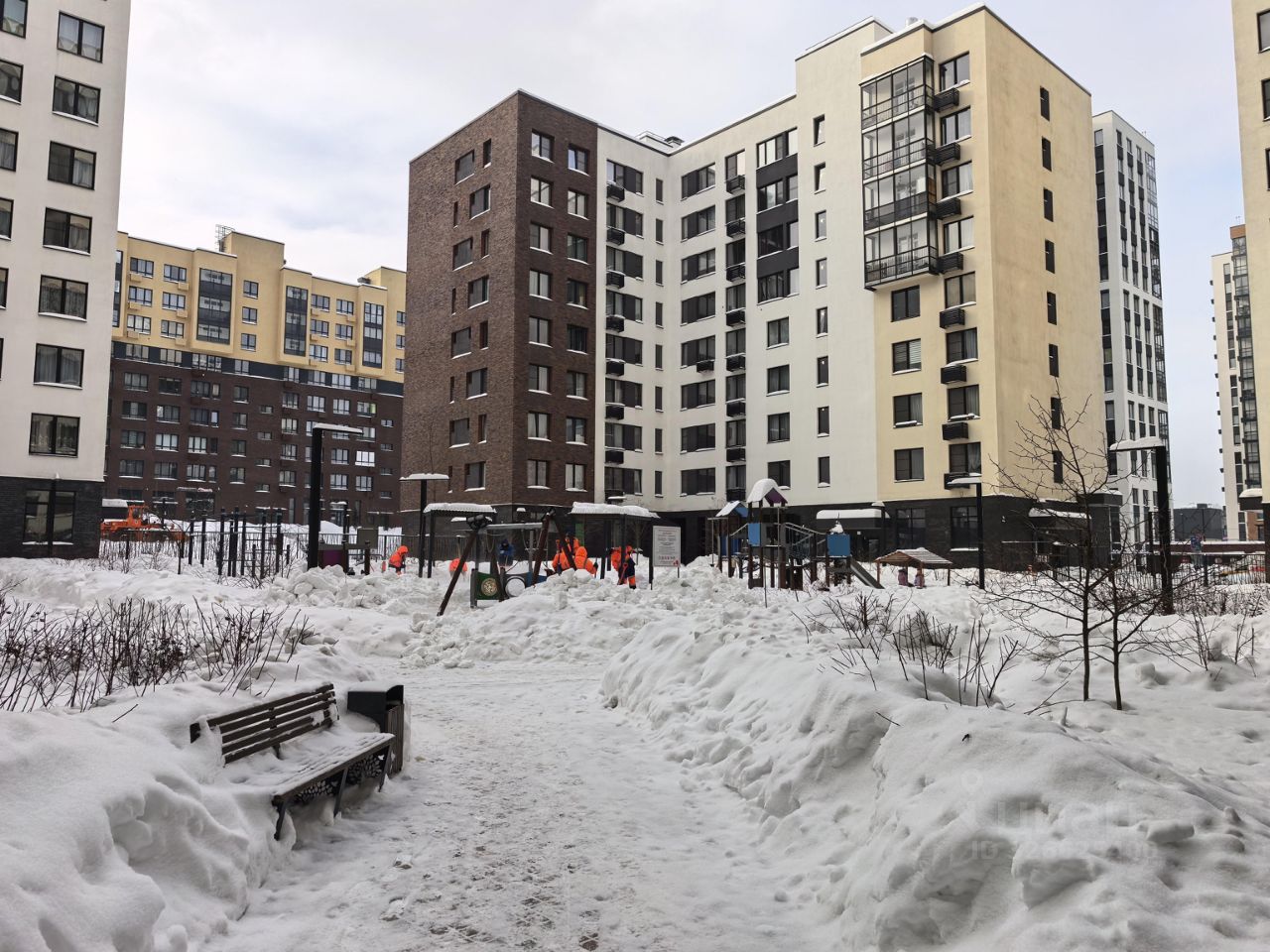 Двор без машин, по перриметру установлен забор, во дворе детская площадка, на первых этажах коммерция (магазин, аптека, барбешоп.. )