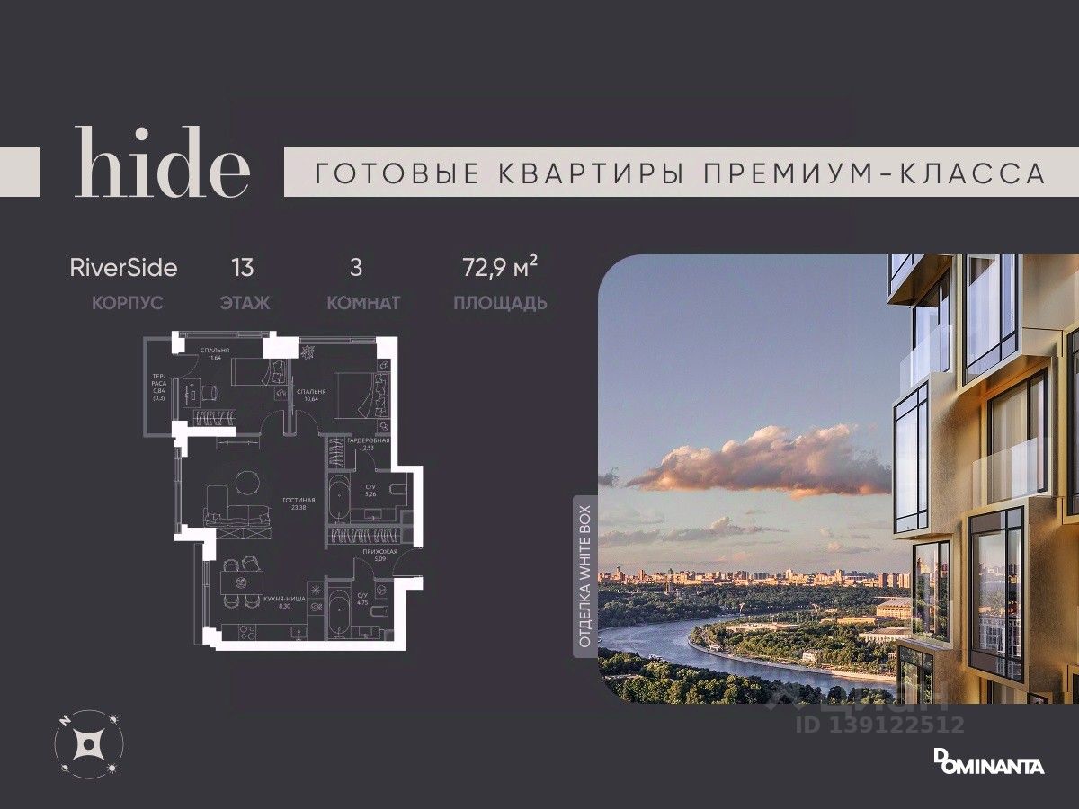 Прямая продажа от застройщика! Дом сдан, ключи в день покупки. Предлагается просторная 3-комнатная квартира 72.9 м² с отделкой white box на 13 этаже в проекте hide — жилом небоскребе премиум-класса от Dominanta и MR. ТОП-ВИДЫ НА 360: Воробьевы горы, Москва-Сити, Лужники, центр, МГУ, Парк Победы. ПРЕСТИЖНАЯ ЛОКАЦИЯ: Расположение на границе районов Раменки и Хамовники: быстро до ТТК, Москва-Сити, а рядом природа — Воробьевы горы и заказники Долины реки Сетунь. КОМФОРТ НОВОГО УРОВНЯ: панорамное остекление, ''Умный дом'', продуманная планировка евроформата. LIFE SPACE ДЛЯ РЕЗИДЕНТОВ: видовая терраса, хоум-офис, фитнес зал, бьюти-кабинет, общественная гостиная. Более 50% двора — ландшафтный парк с холмами и ''парящими'' мостами. СПЕЦИАЛЬНОЕ ПРЕДЛОЖЕНИЕ: скидка 10% при полной оплате и ипотеке без субсидий — действует до 28.02.2026. Не упустите шанс!*Стоимость в объявлении указана со скидкой.