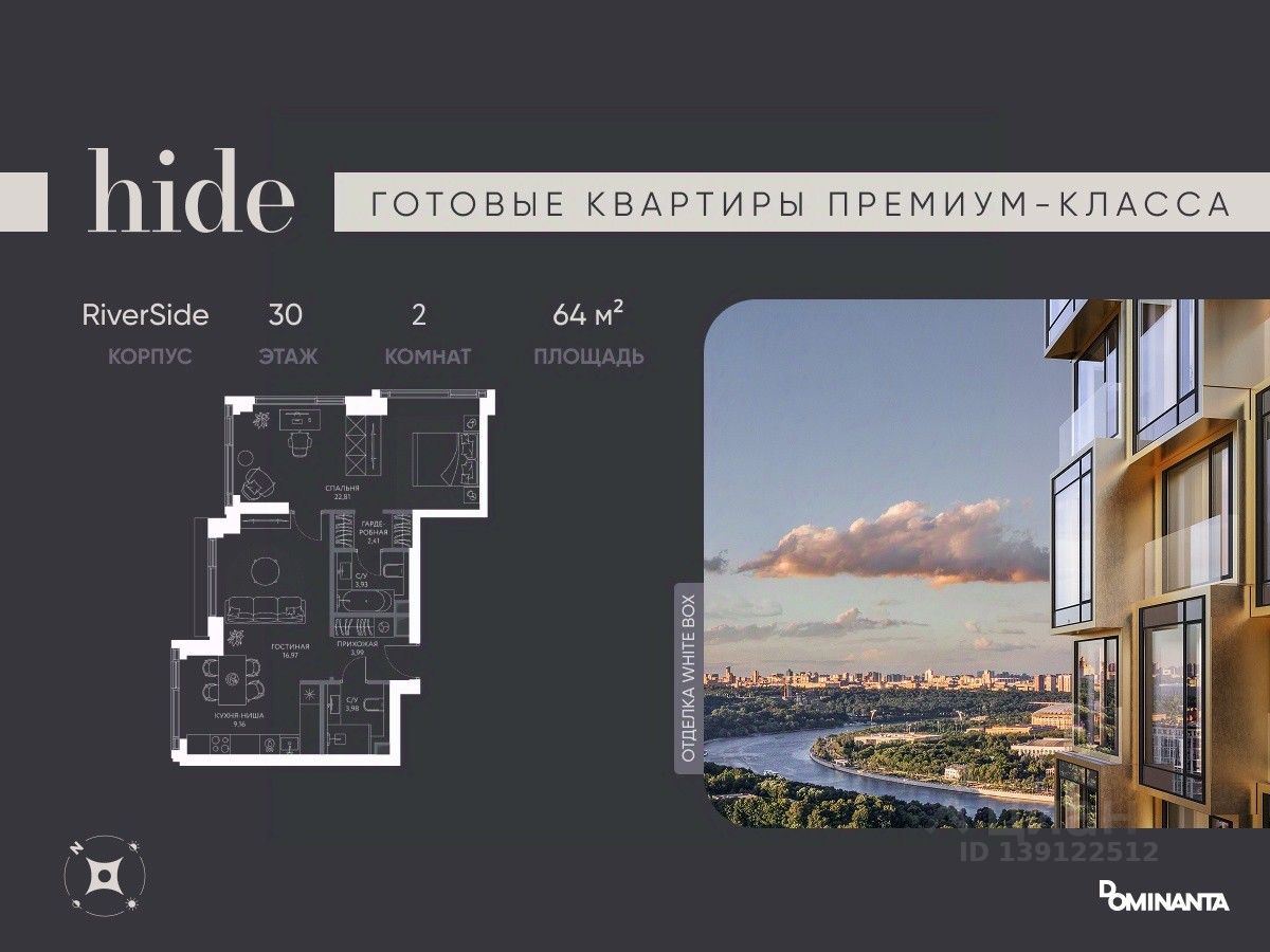Прямая продажа от застройщика! Дом сдан, ключи в день покупки. Предлагается просторная 2-комнатная квартира 64 м² с отделкой white box на 30 этаже в проекте hide — жилом небоскребе премиум-класса от Dominanta и MR. ТОП-ВИДЫ НА 360: Воробьевы горы, Москва-Сити, Лужники, центр, МГУ, Парк Победы. ПРЕСТИЖНАЯ ЛОКАЦИЯ: Расположение на границе районов Раменки и Хамовники: быстро до ТТК, Москва-Сити, а рядом природа — Воробьевы горы и заказники Долины реки Сетунь. КОМФОРТ НОВОГО УРОВНЯ: панорамное остекление, ''Умный дом'', продуманная планировка евроформата. LIFE SPACE ДЛЯ РЕЗИДЕНТОВ: видовая терраса, хоум-офис, фитнес зал, бьюти-кабинет, общественная гостиная. Более 50% двора — ландшафтный парк с холмами и ''парящими'' мостами.