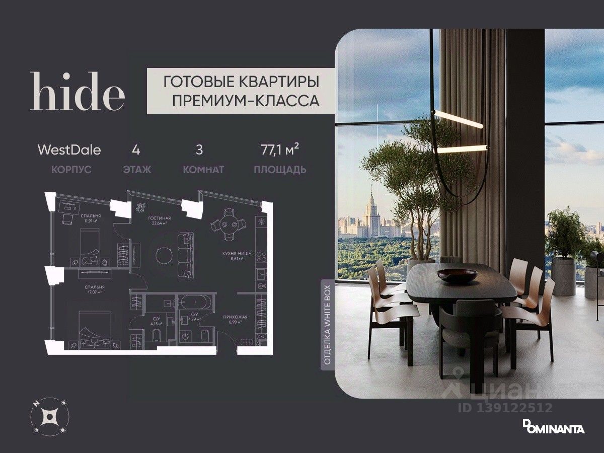 Прямая продажа от застройщика! Дом сдан, ключи в день покупки. Предлагается просторная 3-комнатная квартира 77.1 м² с отделкой white box на 4 этаже в проекте hide — жилом небоскребе премиум-класса от Dominanta и MR. ТОП-ВИДЫ НА 360: Воробьевы горы, Москва-Сити, Лужники, центр, МГУ, Парк Победы. ПРЕСТИЖНАЯ ЛОКАЦИЯ: Расположение на границе районов Раменки и Хамовники: быстро до ТТК, Москва-Сити, а рядом природа — Воробьевы горы и заказники Долины реки Сетунь. КОМФОРТ НОВОГО УРОВНЯ: панорамное остекление, ''Умный дом'', продуманная планировка евроформата. LIFE SPACE ДЛЯ РЕЗИДЕНТОВ: видовая терраса, хоум-офис, фитнес зал, бьюти-кабинет, общественная гостиная. Более 50% двора — ландшафтный парк с холмами и ''парящими'' мостами. СПЕЦИАЛЬНОЕ ПРЕДЛОЖЕНИЕ: скидка 10% при полной оплате и ипотеке без субсидий — действует до 28.02.2026. Не упустите шанс!