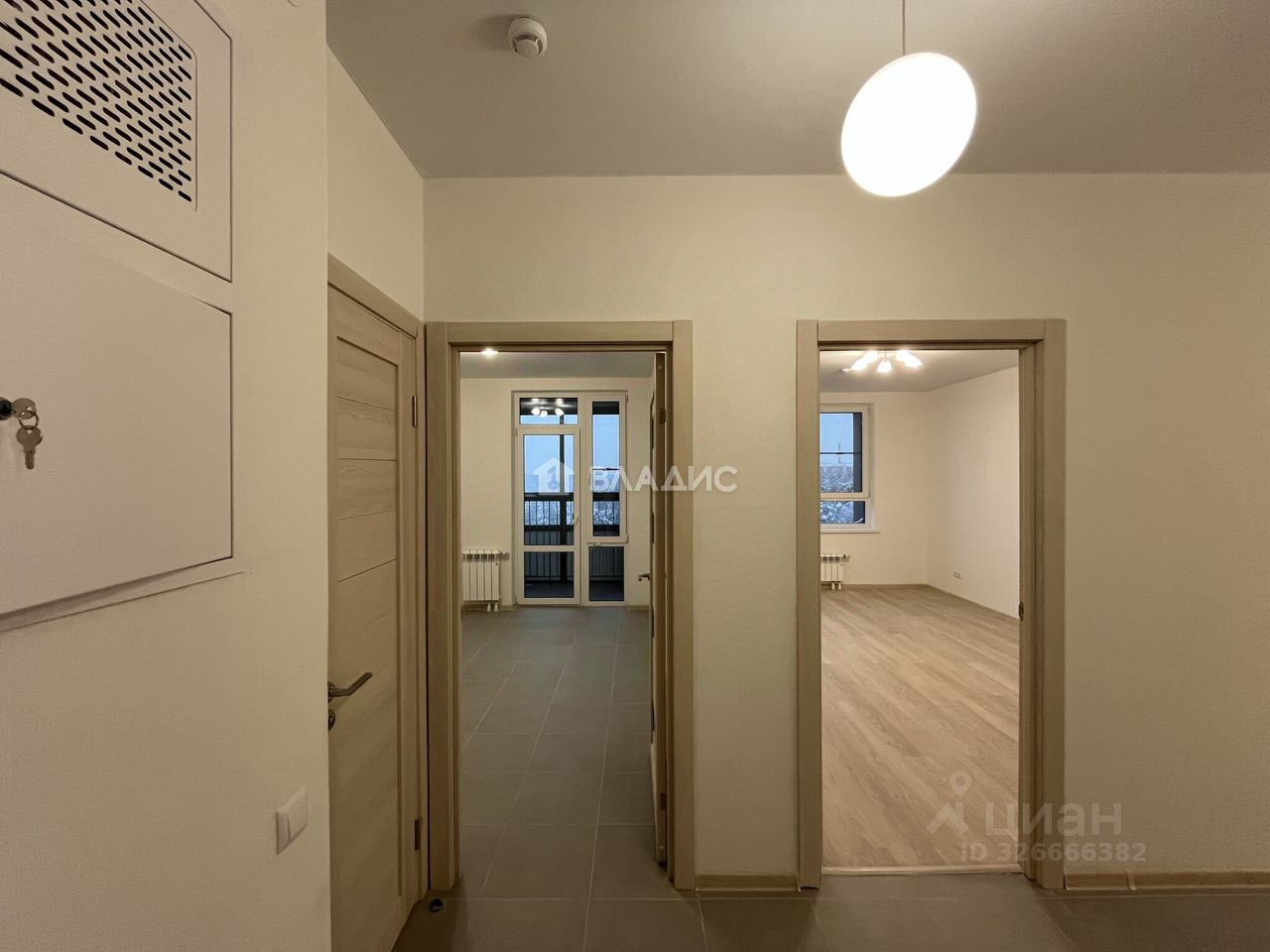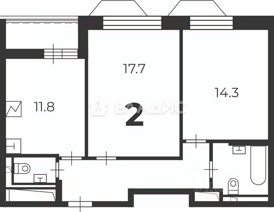 Квартира расположена на 9-м этаже 25-этажного монолитного дома, построенного в 2025 году. Общая площадь квартиры составляет 58,4 кв. м, из которых 11,8 кв. м — кухня. Две комнаты изолированы и имеют общую площадь 17,7 и 14,3 кв. м соответственно. Высота потолков — 2,7 м.