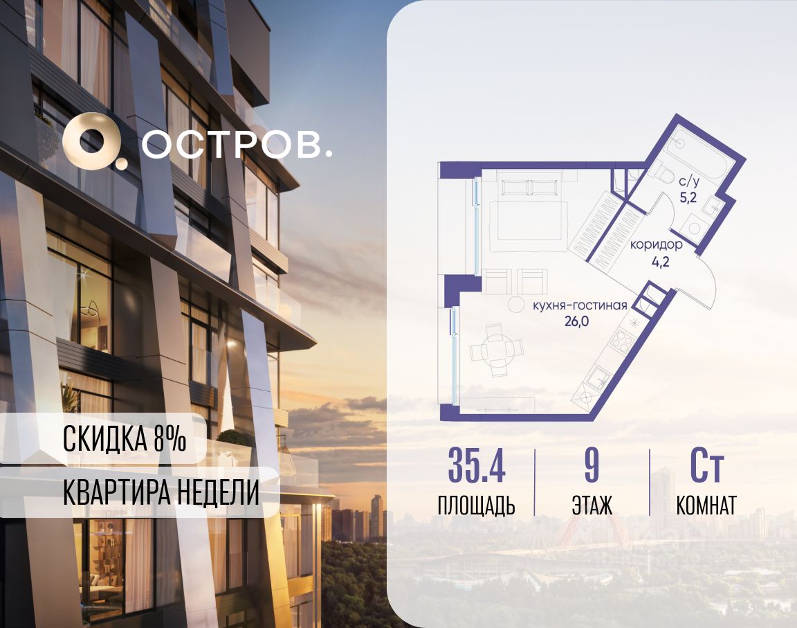 Продаётся студия от застройщика: общая площадь 35.40 м², жилая 20.00 м², кухня 6.00 м², 9, жилой квартал ''Остров 12'', корпус 1 (12.1 квартал) (секция 1). срок сдачи: 4-кв. 2025. , 1 совмещенный санузел. В жилой зоне 2 больших окна на одну сторону, хорошая инсоляция.
