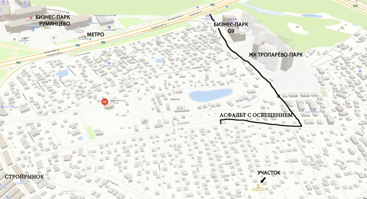 - На участке - двухэтажный садовый дом 43,2м - три комнаты и кухня-терраса (можно и дальше использовать как дачу, гостевой дом, сарай... или переделать во что-то ещё... да хоть снести, если будет мешать строительству нового дома). - 1 (по линейке, пешком не так прямолинейно - 1,25км) км. от Киевского шоссе - Микрорайон Тропарёво-парк с Пятёрочкой, Магнитом и прочими - 700м(1км) - Метро: Румянцево 1(2)км, Саларьево - 2(2,88)км, Тютчевская - 2км - 1 км. от МКАД - Недалеко Бизнес-парки G10 (1км) и Румянцево (1км), МЕГА Теплый Стан (3км), Салярис (2км), Фудсити (1км), несколько стройрынков (Строймастер, Славянский мир и др.) - в пешей доступности...