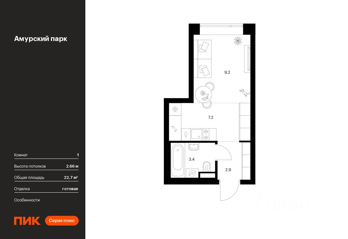 Продаётся квартира-студия площадью 22,7 кв.м на 17 этаже 27 этажного дома (Корпус 4.5, Секция 6) проекта ПИК Амурский парк. Светлый просторный подъезд на уровне земли, функциональная планировка, большие окна, c отделкой.